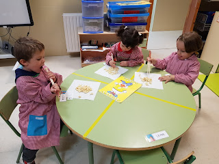 Después hemos utilizado unas "tijeras pinzas" muy especiales con las que teníamos que coger un pompón y colocarlo en la tarjeta con el 1.